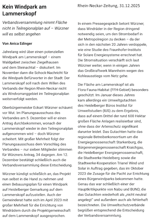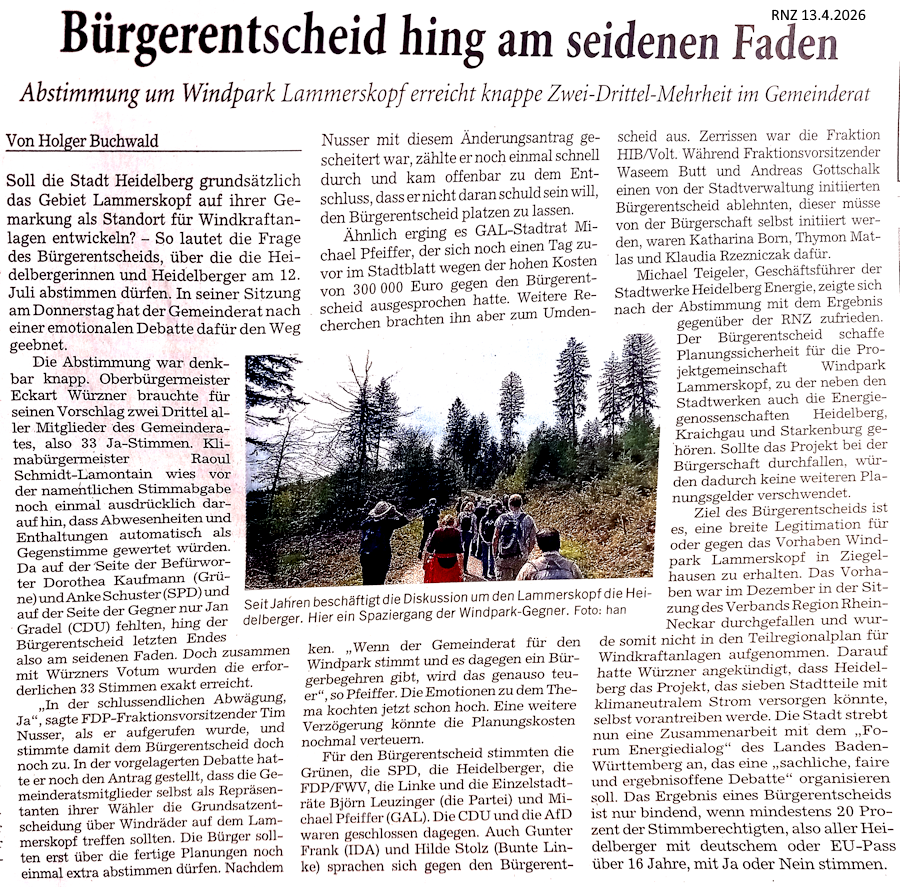 Der für Windenergievorranggebiete zuständige Regionalverband VRRN lehnte Ende 2025 die Aufnahme des Lammerskopfs in den Windenergieplan der Region Rhein-Neckar ab. Trotzdem soll dort ein Windenergiepark gebaut werden. Dazu beschloss der Gemeinderat die Durchführung eines Bürgerentscheids in Heidelberg am 12.7.2026.